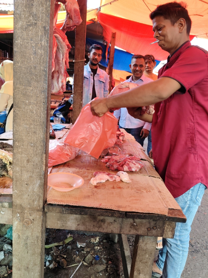 The image depicts an outdoor market stall in Tuha Gp Gajah, Indonesia. In the immediate foreground to the right, a man in a red collared shirt and blue jeans is actively handling cuts of raw meat on a weathered wooden table. A lit cigarette is positioned in his mouth. His left hand holds a red plastic bag open, while his right hand holds a piece of light-colored meat, appearing to place it into the bag or onto the table. The wooden table surface is covered with a light-colored, stained material and displays various pieces of red and lighter-colored raw meat. A small, light orange plastic bowl containing liquid is situated on the table to the left. Behind the man handling the meat, three other men are visible. From left to right: a man with a beard wearing a light blue denim jacket, a smiling man in a light blue button-up shirt, and a partially visible man in an orange t-shirt. Further in the background, hanging pieces of raw meat are suspended from wooden beams. The stall structure consists of visible wooden pillars and beams, partially covered by red and blue tarpaulin canopies. To the far left, a person wearing a light-colored head covering and yellow garment is partially visible. The ground beneath the wooden table is unpaved, showing dirt and scattered debris including plastic fragments.