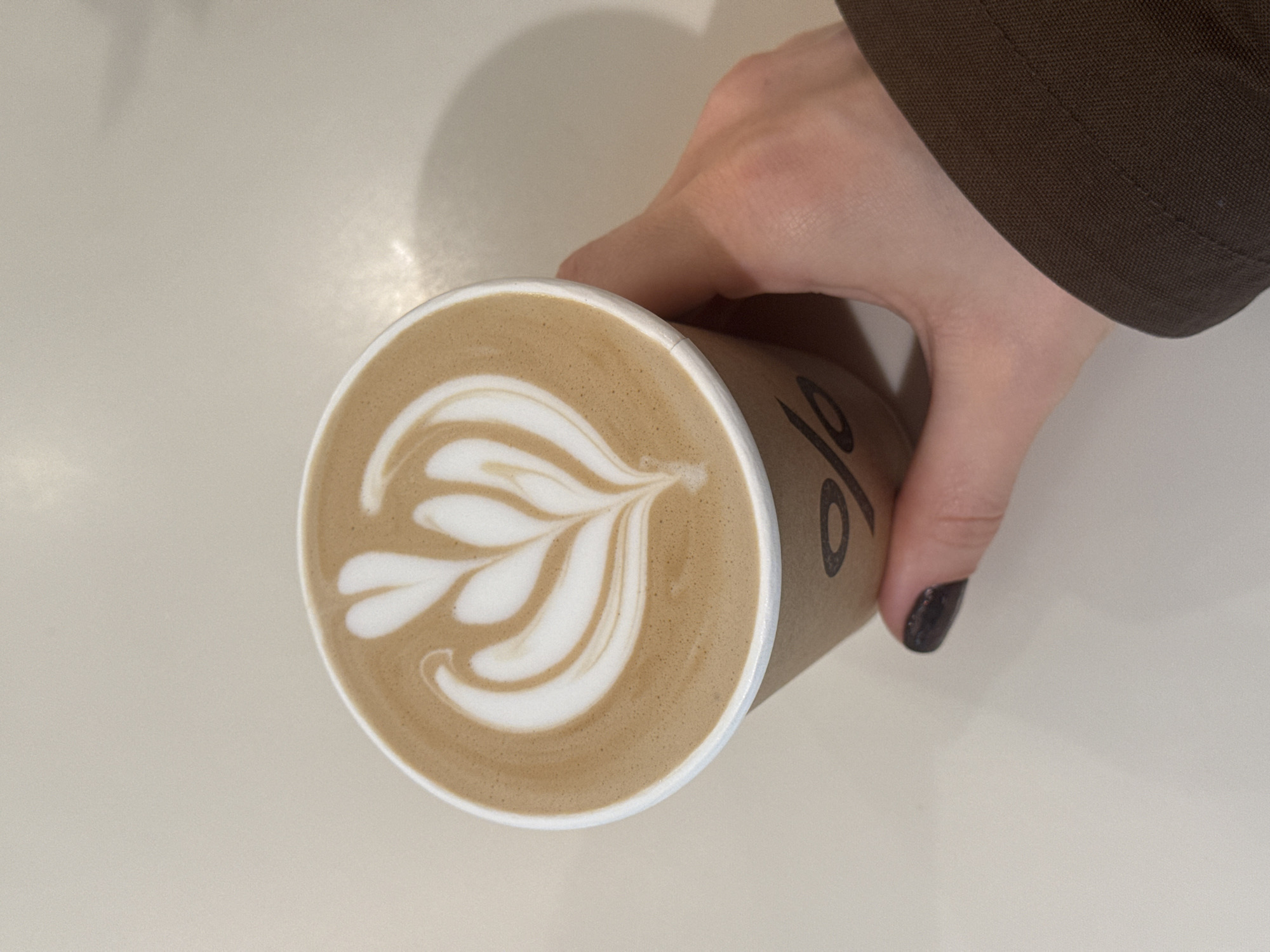 A forensic examination of the image reveals a disposable brown cardboard coffee cup with a prominent black percentage symbol ('%') logo, identifying it as a product from the % Arabica coffee chain. The cup contains a latte topped with intricate white foam art, displaying a symmetrical, stylized leaf or heart pattern. A person's right hand holds the cup from the right side; the thumb exhibits dark-colored nail polish. A dark brown fabric sleeve, likely from a jacket or coat, is visible in the lower right corner, partially covering the forearm. The cup rests on a uniformly light, possibly off-white or light beige, surface, consistent with a countertop or table within an indoor setting. This scene is situated at an % Arabica location in London, United Kingdom.