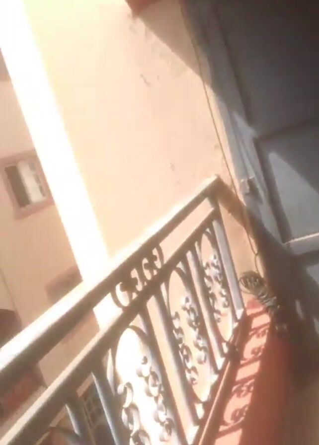 A person is sitting and looking down. They have black hair braided into small sections that go down the sides of their head. They are wearing a green shirt with the words "Breaking New Ground" and a pink towel around their neck. A red container sits in the background on a shelf near a window with a white frame. The wall is painted light pink. The camera pans up from behind the person to focus on their face.