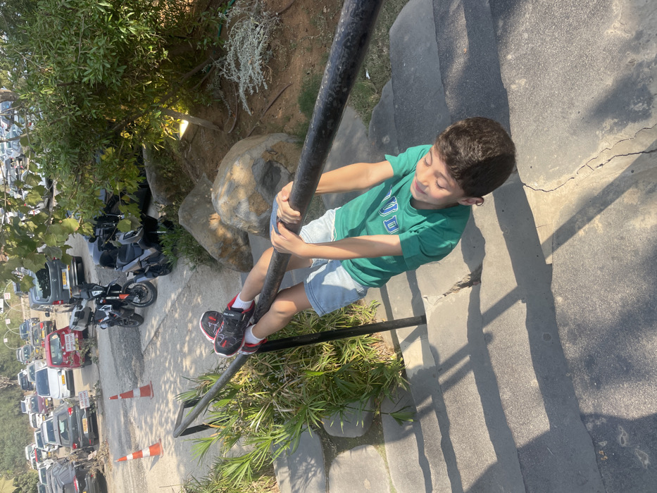 - "The image depicts an outdoor scene in Tel Mond, Israel, centered on a pre-teen male child suspended inverted from a dark, sturdy metal handrail" by FM-AyUtz1, licensed under CC BY 4.0