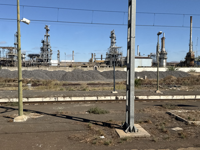 The image depicts an industrial landscape in Sidi Kacem, Morocco, characterized by a large refinery complex viewed from a railway area