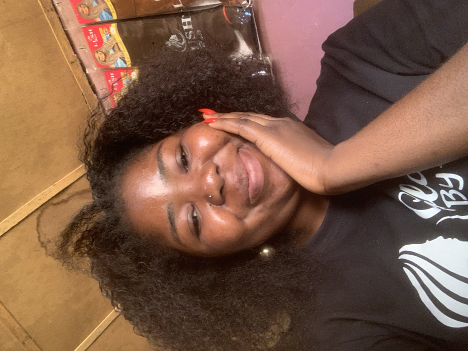 An adult Black female with dark, curly hair smiles directly at the camera