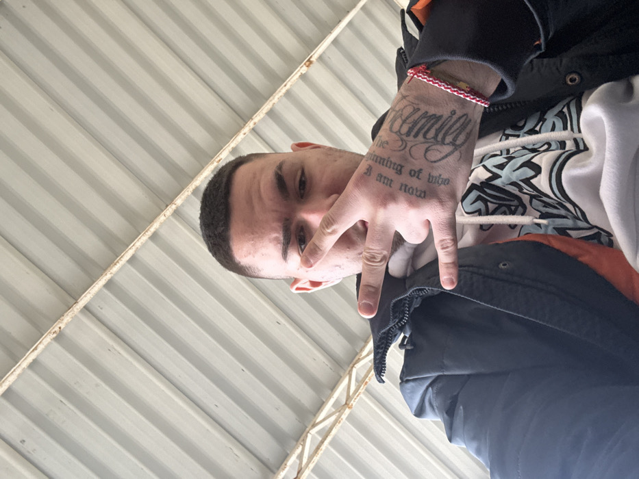 A young adult male is depicted in a close-up, low-angle shot, positioned beneath a corrugated metal ceiling. He has short, dark, closely cropped hair. His facial expression is neutral. He wears a dark blue or black jacket with an orange interior lining, layered over a white hoodie featuring a light blue and grey graphic design. Small white earbuds are visible in both ears. His right hand is raised, partially obscuring the lower portion of his face, performing a gesture with the thumb and pinky extended and the middle three fingers curled. The back of his right hand and wrist is heavily tattooed with black ink script. A red and white braided bracelet is worn on his right wrist. The background features a light-colored corrugated metal ceiling with parallel ridges. A thin, diagonal metal beam with visible rust streaks traverses the upper portion of the frame, and a metal truss structure is partially visible on the left. The scene is located in Yambol, Bulgaria.