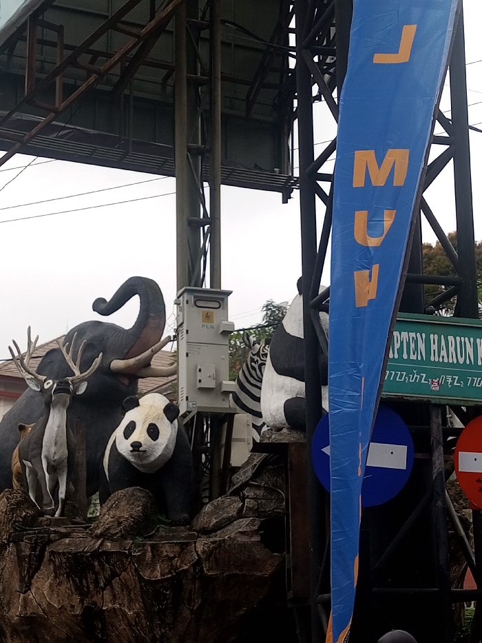 A whimsical animal display features an elephant, two deer, a panda, and a zebra, arranged atop a faux rocky terrain. An electrical box stands near the elephant. A blue banner with vertical yellow lettering reads "LMUW," and a green sign mentioning "KAPTEN HARUN" sits behind. The scene is framed by a metal structure, possibly a utility pole, and a cloudy sky provides the backdrop.