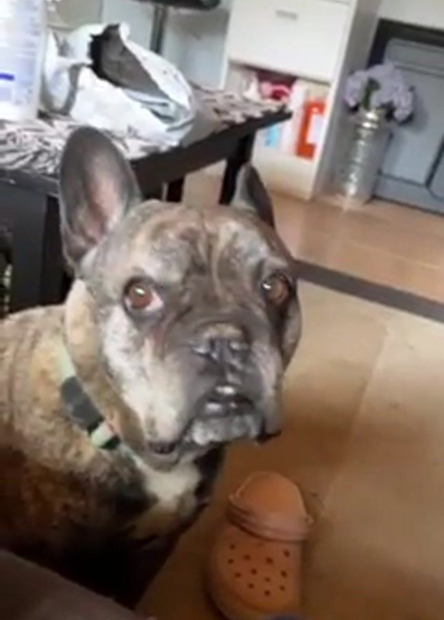 brindle French bulldog sitting indoors. The dog is wearing a neon green collar with a black tag. Beside the dog on the floor is a small, tan-colored Croc shoe. The dog looks to the right, blinking. The room has a wooden floor, a white cabinet in the background, a dark-colored table, and a partially-visible person sitting on a couch.