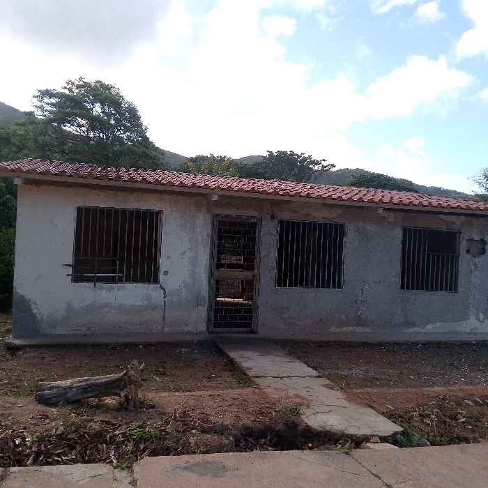 A single-story, rectangular residential structure, located in La Tagua, Venezuela, is depicted under a partly cloudy sky