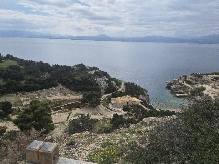An elevated, wide-angle photograph depicts a coastal landscape in the Municipal Unit of Loutraki - Perachora, Greece, under an overcast sky. In the immediate foreground, a weathered wooden post occupies the lower left corner, set against rocky, overgrown terrain dotted with sparse green shrubs and small yellow and white flowers. The mid-ground features a significant archaeological site to the left, characterized by excavated stone foundations and low walls laid out on a beige, earthen surface, interspersed with scattered trees and dirt pathways. To the right, a small, light-colored building with an orange-tiled gabled roof is positioned on a rugged promontory, overlooking a secluded, clear turquoise cove. A winding dirt path leads towards this building from the upper terrain. Below the building, near the water's edge of the cove, a blue and white Greek flag is visible. Dense dark green foliage, primarily shrubs and trees, covers much of the hilly terrain separating the foreground from the sea and surrounding the structures. The background is dominated by a vast expanse of calm, deep blue-grey water, likely a gulf or bay, with subtle reflections of light on its surface. Beyond the water, a hazy chain of blue-grey mountains stretches along the distant horizon. The sky is largely overcast, displaying various shades of grey and white clouds. No human figures or discernible animal life are present in the scene.