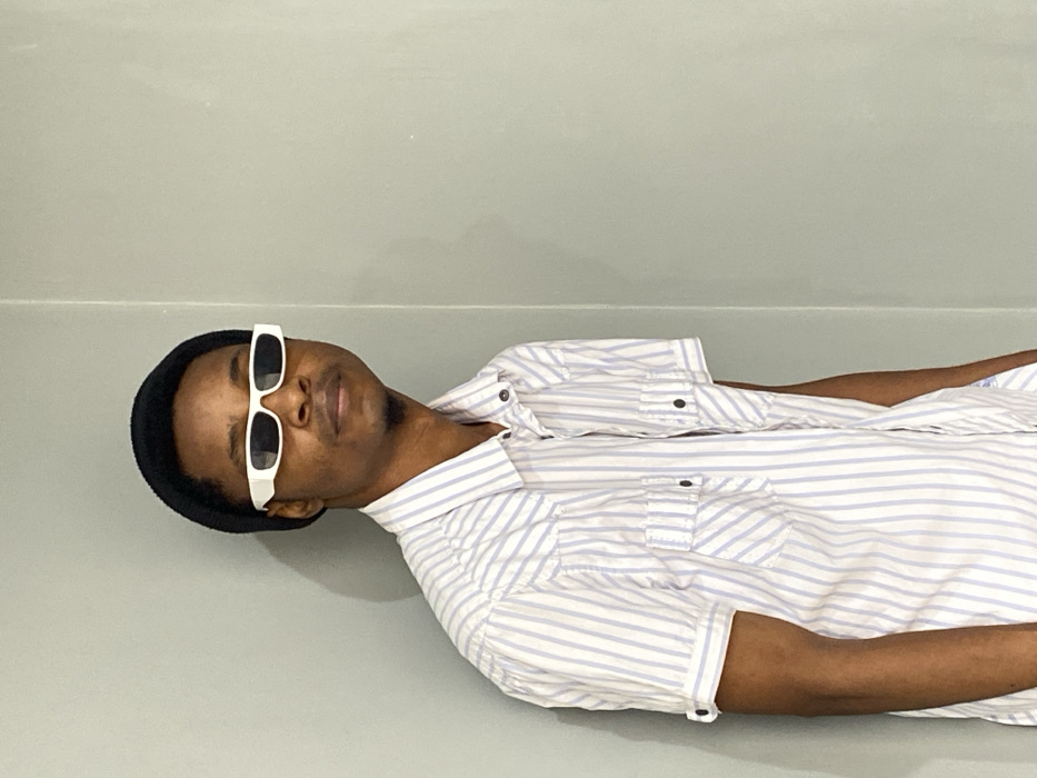 - "A man lies on a grey surface, wearing a black beanie, white rectangular sunglasses, and a light blue and white striped, short-sleeved button-down shirt with a pocket" by FM-pLZic2, licensed under CC BY 4.0