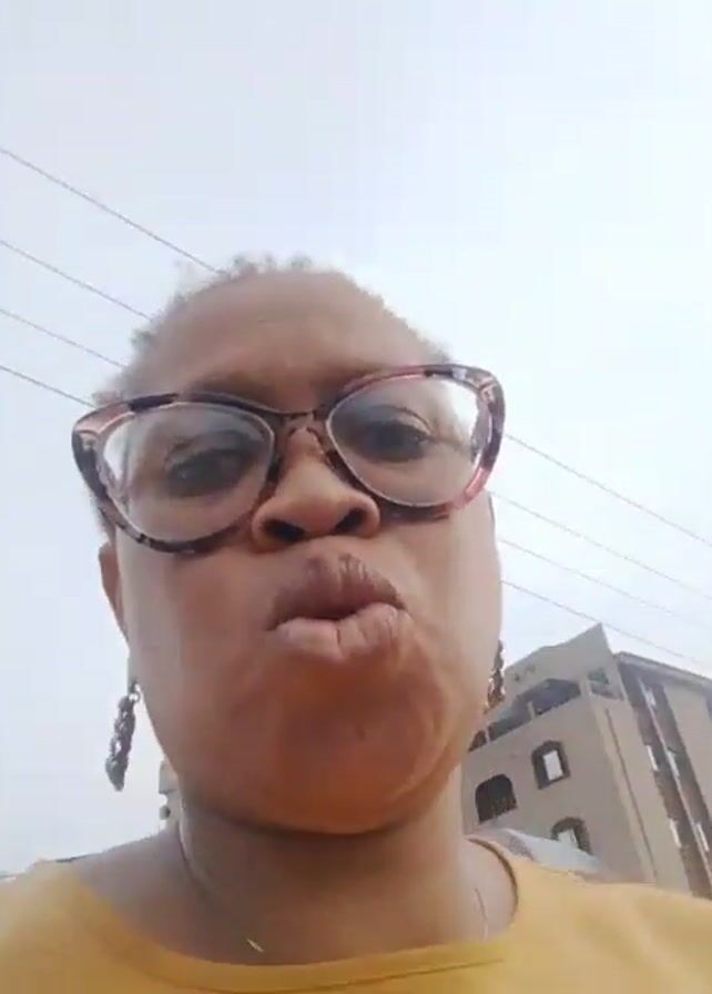 A woman with brown and pink glasses, light brown skin, and a yellow shirt is looking into the camera. She makes several faces including pouting, sticking her tongue out, and making a kissing face. She is wearing earrings and a silver necklace. The background shows buildings, wires, and a tent-like structure.