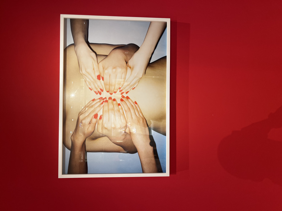 A framed photographic artwork is centrally displayed on a solid red wall. The image within the white frame depicts a light-skinned human torso, cropped from the upper chest to the navel. Eight hands, arranged in four pairs, cover the chest area, with each pair positioned over one breast. All visible fingernails on these hands are painted bright red. Variations in skin tone among the hands are discernible. Reflections of overhead light fixtures are visible on the artwork's glass surface. A soft, elongated shadow is cast on the lower-left portion of the red wall. This scene is located within a gallery or museum environment in Paris, France.