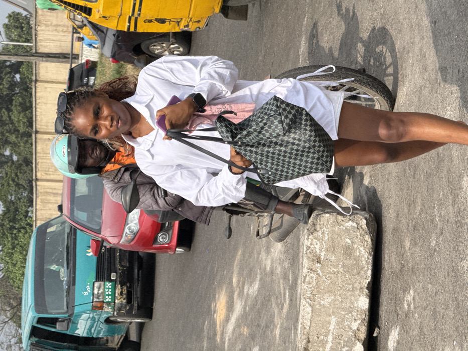 The scene depicts a street in Alagbede, Nigeria, under daylight conditions. In the foreground, a young adult female with dark skin and braided hair, wearing a white collared shirt dress with drawstring details on the sides, walks right-to-left. She wears sunglasses on her head and a black smartwatch on her left wrist. Her left hand holds a dark green and black patterned tote bag, and her right hand holds a pink object, possibly a phone or fabric. Behind her, a male individual with dark skin, wearing a light blue helmet, an orange shirt, and a dark jacket, is seated on a black motorcycle. His feet are visible in dark shoes. Further in the background, a teal-green commercial van with visible wear and Arabic script is positioned on the left side of the road, followed by a red sedan. On the far right, a yellow commercial vehicle is partially visible. The road surface is asphalt, and a rough concrete barrier block is present in the lower-left foreground. A plain concrete wall spans the mid-ground background.