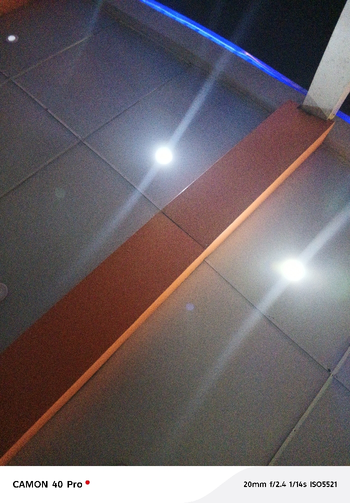 The image is an angled upward shot of a ceiling with grid-like tiles