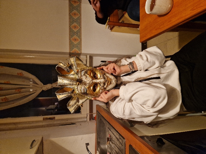 A person sits at a table, wearing a white sweatshirt and black pants. A decorative mask with gold accents covers their face. A wooden table with a cup on it is visible, and a window with a tied-back curtain is to the left. A wooden cabinet with a silver handle sits beneath the table. The background includes a decorative wall border.