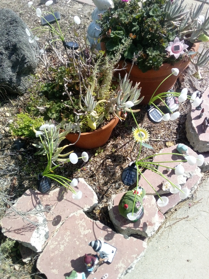 This image depicts an outdoor residential garden or yard area within the city of Los Angeles, United States of America. The scene is illuminated by direct sunlight, casting distinct shadows. The ground surface is a mix of dry soil, organic mulch resembling pine needles, and scattered fragments of reddish-brown concrete or paver stones, which form an informal pathway or border. A section of lighter grey concrete paving is visible along the lower right edge. Several plants are present in terracotta pots and directly in the ground. A large, prominent terracotta pot in the upper right contains a dense, broad-leafed green plant and a lighter green succulent plant, alongside a pink flower-shaped solar light. To its left, another terracotta pot contains various succulents with elongated, pale green leaves and some dried plant material. Small patches of bright green ground cover are visible on the soil. A large, dark grey rock is positioned in the upper left corner. Numerous decorative garden elements are distributed throughout the scene: - Three sets of solar-powered LED garden lights, each designed as a cluster of white-capped mushrooms on green stems, are visible. Each set has a small black solar panel. One is on the far left, one in the center-right, and another further right. - A yellow daisy-shaped solar light is located near the center. - A light-colored statue, possibly a birdbath or garden gnome, is partially visible behind the large terracotta pot. - On a concrete slab in the lower center, two small garden gnome figurines (one predominantly black and white, one with red and blue accents) are arranged alongside other miniature items. - A green, textured, spherical object with white stitching and red accents rests on a concrete slab in the lower right quadrant. - A small, light blue hedgehog figurine is placed on a concrete fragment in the upper right quadrant. - Small yellow decorative elements, resembling birds or insects, are embedded among the succulents in the pots. No human or animal subjects are visible. The scene is static, captured in bright daylight.