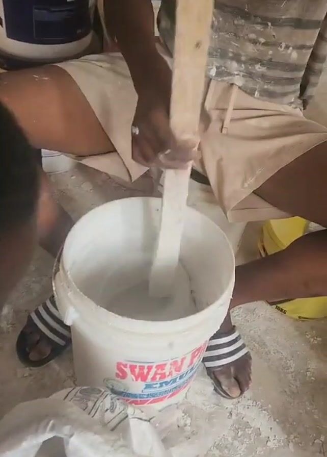 A person is sitting cross-legged on a concrete floor, mixing a white substance in a white bucket labeled "SWAN PAINT" with a wooden stick
