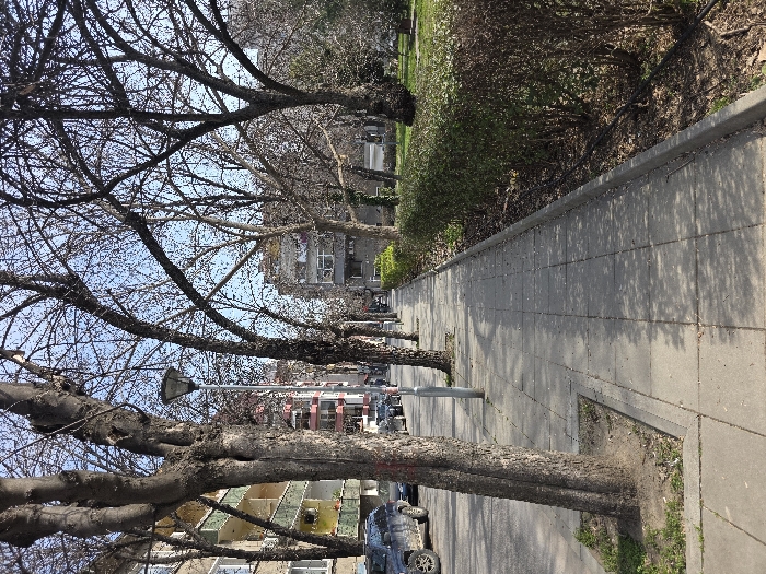 An urban street scene in Plovdiv, Bulgaria, is depicted on a clear, sunny day, likely in late winter or early spring due to the bare deciduous trees. The view is down a straight concrete slab sidewalk that extends from the foreground into the background. To the left of the sidewalk, a paved asphalt street runs parallel, lined with multiple parked vehicles. The closest vehicle, partially visible on the far left, is a dark-colored SUV, appearing dusty or muddy. Behind the street are multi-story residential buildings, some featuring prominent balconies with yellow and green facades. Several tall, mature deciduous trees with gnarled, bare branches stand between the sidewalk and the street, casting distinct shadows across the pavement. A single, gray metal street lamp post with an upward-facing dark luminaire is positioned centrally among these trees. To the right of the sidewalk, a low, dense hedge forms a continuous barrier, separating the pedestrian path from a grassy green area or parkland. Additional bare trees are visible within this green space. No individuals or animals are present in the frame, and no discernible actions or interactions are occurring. The environment appears calm and static.