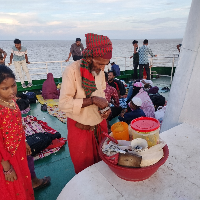 An elderly man in traditional attire stands beside a large red bowl filled with food items on a ferry