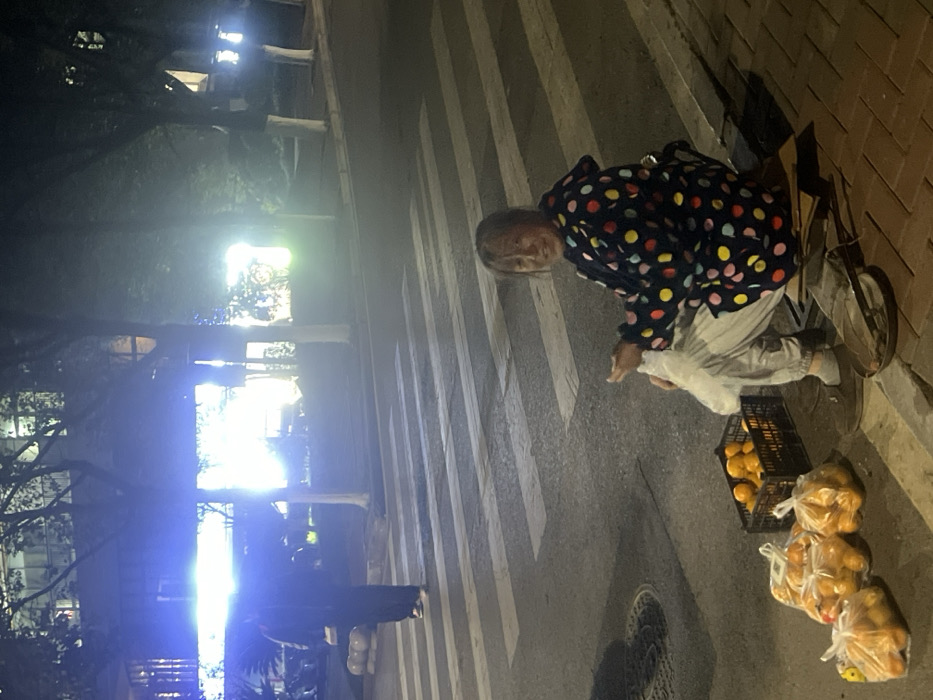 The image depicts a nighttime urban street scene in Jiangjin, China. In the foreground, an elderly individual, likely female, with light-colored hair, is seated on a piece of cardboard on a brick-paved sidewalk. She wears a dark hooded jacket adorned with multi-colored polka dots, light-colored pants, and dark flat shoes. She faces forward, looking towards the camera with a slight smile, and holds a clear plastic bag in her hands. Adjacent to her, on the ground, are five clear plastic bags containing oranges, positioned next to a black plastic crate also filled with oranges. A metal scale or weighing device rests on the sidewalk immediately in front of her. The asphalt road in the mid-ground features a pedestrian crossing delineated by white stripes. To the left of the pedestrian crossing, another individual in dark clothing stands. The background includes several trees with light-colored trunks lining the street and a building emitting bright artificial lights that create significant glare. A circular manhole cover is visible on the street surface near the oranges. Concrete bollards are present on the far side of the pedestrian crossing.