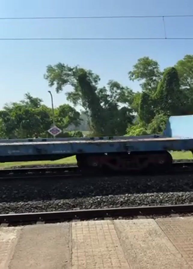flatbed rail car moving on a track. The car is mostly blue, with some rust. The video is taken from a slightly elevated position, possibly a platform. Trees and some buildings are visible in the background under a clear blue sky. The focus is on the rail car as it passes by.