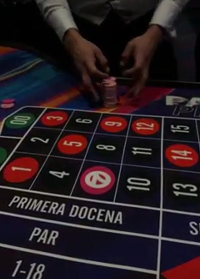 A person is placing two stacks of pink poker chips onto a roulette table. The table is dark blue, and sections are labeled with various bets. The table is labeled with numbers 0, 1, 3, 4, 5, 6, 7, 8, 9, 10, 11, 12, 13, and 14. There are also sections labeled "PRIMERA DOCENA," "PAR," and "1-18." The person is wearing a light gray vest and a white shirt. The person places the two stacks of chips close together, near the center of the table.