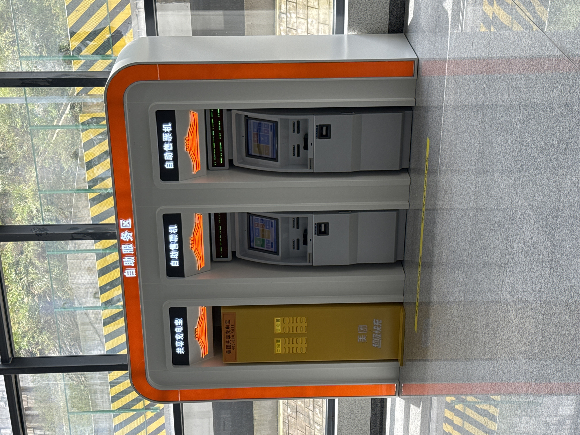 The image depicts a self-service kiosk in what appears to be a transportation hub in Wulong District, China. The kiosk is white with orange trim and features several vending machines, including two ticket vending machines ("自助售票机") on the upper levels. At the bottom level is a power bank or portable battery rental station ("共享充电宝") branded by Meituan, a Chinese e-commerce platform. The kiosks are labeled with Chinese characters, including the phrase "Self-service area" ("自助服务区"). The ground is gray and textured and is marked with yellow and black caution stripes. A glass wall sits behind the kiosk.