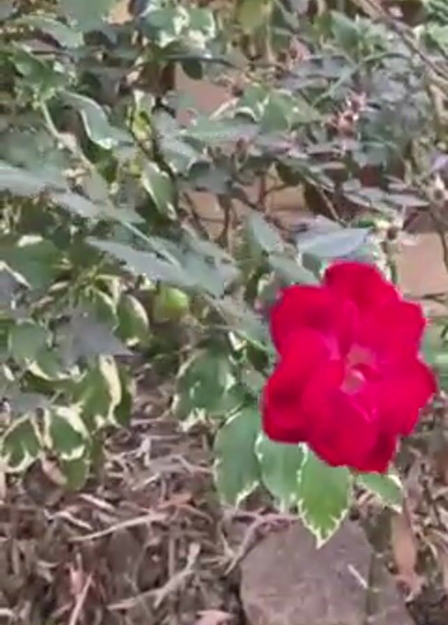 close-up of a red rose blooming on a bush. The rose is the main focus, with its vibrant petals fully open. The bush has green leaves with white edges, and a few other small buds are visible. The background is blurred, showing a brown, dry ground cover. The camera slightly zooms in on the rose as the video progresses.