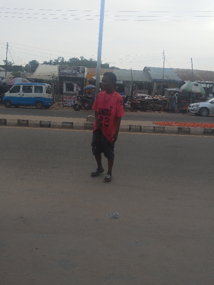 A daytime street scene in Zango-ndaji, Nigeria, captures a market area under an overcast sky. In the foreground, a dark asphalt road surface is visible, with a crumpled light-colored object lying on it. A dark-skinned male, appearing to be in his late teens or early twenties, stands in the midground, oriented slightly left from the viewer. He wears a red t-shirt with "ANDRI 22" printed in white, dark shorts, and dark slide sandals featuring "BOSS" in white text on the left sandal. His hands are in his pockets. To his right, a light-colored utility pole extends vertically. Behind him, a concrete curb separates the road from a pedestrian area where red produce, likely tomatoes, is spread directly on the ground. In the background, on the far side of the road, a commercial strip features various single-story structures and market stalls with corrugated metal roofs. A blue and white minivan is parked on the left, facing left. Several signs are visible on the buildings, including one advertising "P.O.S SERVICES." A dark motorcycle is parked nearby. Further right, numerous market stalls display goods, with several individuals visible, including one under a green umbrella. A silver sedan is parked on the right, facing right. Overhead power lines span the upper portion of the background, and distant trees are visible above the buildings. The overall scene depicts typical daily activity in a Nigerian market street.