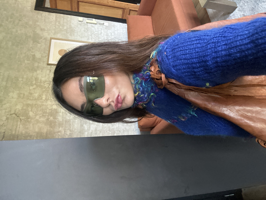 The image captures a female subject positioned indoors in Antwerp, Belgium. The subject has long, dark brown hair and is wearing large, green-tinted, rimless shield-style sunglasses. Her lips are pursed into a glossy pink 'kiss' expression. She is dressed in a royal blue, fuzzy knitted turtleneck sweater; the turtleneck section displays interwoven multicolored yarn in shades of blue, green, yellow, pink, and purple. A light brown, slouchy leather shoulder bag with a distinct woven strap detail is visible over her right shoulder. The background features a dark gray vertical panel on the left. To the right, a textured, light beige wall is visible, on which a framed, minimalist abstract artwork hangs. A rust-orange sofa is partially visible behind the subject, and further right, a dark-framed doorway and a portion of a light-colored table are present. The floor is covered by a light-colored rug.