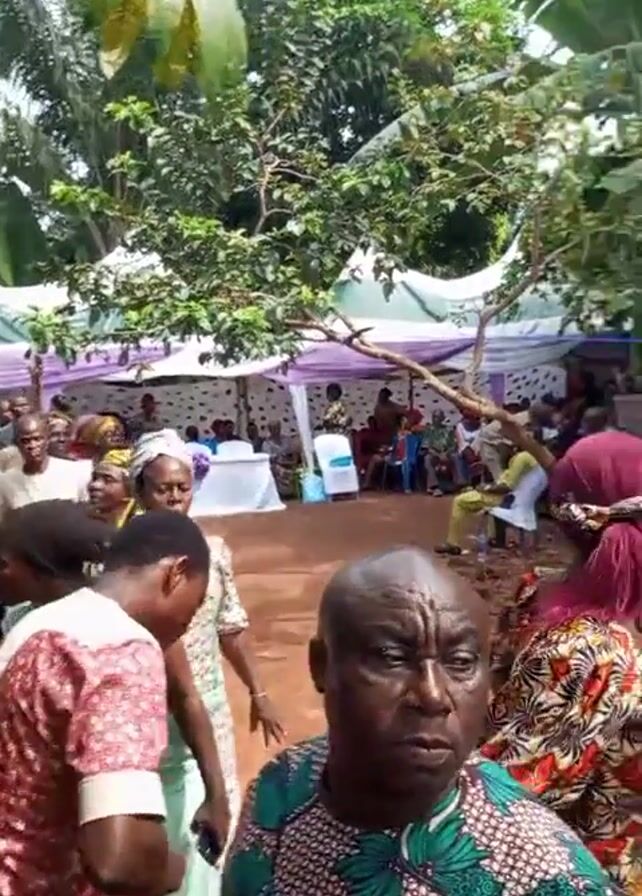 The video captures a lively outdoor event, likely a celebration or gathering. Many people dressed in colorful attire are present. Some are gathered under a tent decorated with white and purple accents, sitting on chairs, while others are mingling and dancing to music. There are green trees and other foliage in the background, indicating an outdoor setting. The event appears to be vibrant and celebratory.