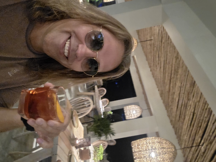 An individual with long, light brown hair and gold-framed round sunglasses is captured in a selfie-style photograph, smiling broadly while holding a clear glass tumbler containing an amber liquid with an orange peel garnish in their right hand