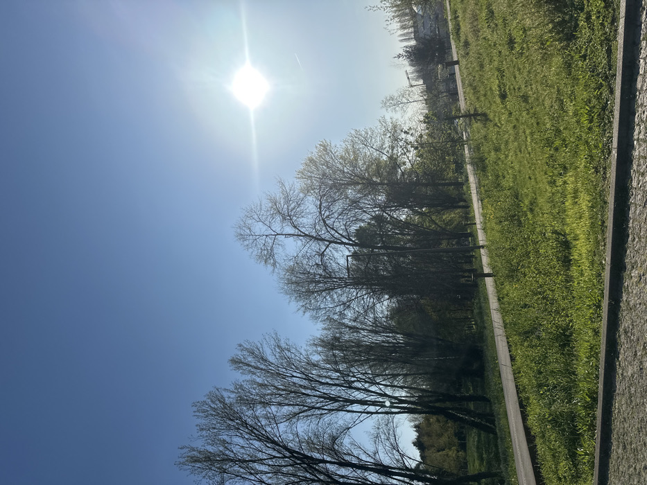 The image displays an outdoor environment on a clear, sunny day in Guimarães, Portugal, specifically consistent with an area within or bordering the Parque da Cidade. The upper portion of the frame features a bright blue, cloudless sky. The sun is prominently visible in the upper right quadrant, emitting a strong, star-shaped lens flare. A faint white contrail is observable to the right of the sun. The immediate foreground, occupying the bottom approximately 10% of the image, consists of a dark, textured paved surface, likely cobblestone, with a defined, dark gray curb running horizontally across the frame. Above this curb, a strip of vibrant green grass slopes gently upwards and to the right. A light-colored, paved pathway or track traverses the midground, curving diagonally from the lower left to the upper right. Several dark-colored, slender streetlights or bollards are spaced along the edge of this pathway. The background is dominated by a dense line of trees, many appearing deciduous with bare branches or just beginning to show light green foliage, suggesting early spring. These trees obscure the horizon line. In the far upper right, beyond the treeline, several construction cranes and indistinct light-colored structures are faintly visible against the sky, indicating an urban or developing area adjacent to the parkland. No individuals or specific activities are depicted in the scene.