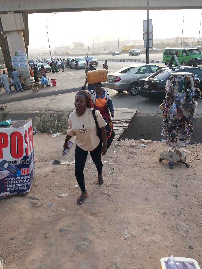 The image depicts a bustling urban roadside in Kagini, Nigeria, situated under a concrete elevated overpass. The foreground consists of uneven, dusty brown earth with scattered litter. To the left, a white cuboid structure labeled "POS" in red, advertising cash services, stands with a pair of green flip-flops on its top surface. A woman in a light beige t-shirt with a "CK" logo, black leggings, and dark sandals walks forward, holding a small white object in her right hand and a black shoulder bag. Directly behind her, an older woman in a multi-colored patterned top and red skirt balances a yellow-brown jerrycan on her head. To the right, a metal display rack on wheels, weighted by rocks, exhibits numerous sunglasses and small accessories. A makeshift wooden plank bridge spans a small drainage ditch separating the dirt path from the paved road. The midground features a multi-lane asphalt road with moderate traffic, including a silver sedan, a black sedan, a green commercial van, and various other vehicles. Along the road's shoulder, several individuals and small groups are present, some appearing to be vendors or commuters. A large concrete pillar, part of the overpass support structure, is visible on the left, with a metal lamppost further right. The background shows a hazy distant urban landscape with more vehicles and blurred structures under a pale sky.