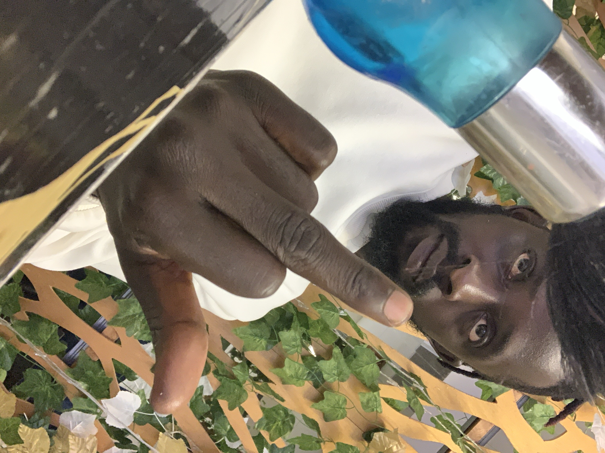 A close-up, slightly tilted photograph shows a man with dark skin, a beard, and dreadlocks, positioned against a backdrop of artificial green and gold foliage, potentially suggesting an indoor setting with decorative elements. The man is pointing his middle finger towards the camera. He is wearing a white shirt. A blue and silver water bottle is visible in the upper right corner, while part of a black object is in the upper left. No specific buildings or landmarks are visible to definitively place this image in Lekki, Nigeria.