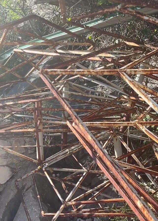 The video starts with a close-up of a rusted metal frame structure amidst rocks and greenery