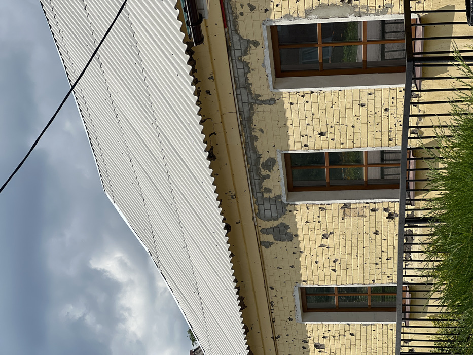 A building in Staryi Saltiv, Ukraine, stands under a cloudy sky. The structure features a white, corrugated roof with a distinct wavy eave. The upper facade is constructed of light yellow brick or painted masonry, displaying numerous small, dark impact marks consistent with projectile damage. Below the roofline, a band of light grey, exposed brickwork is visible where the yellow surface has peeled and flaked. Three rectangular windows with multi-paned, brown wooden frames are set into the damaged facade. In the foreground, a black metal railing with vertical bars extends horizontally, partially obscured by green foliage. A single black utility line traverses the upper right portion of the frame. No individuals are present in the scene.
