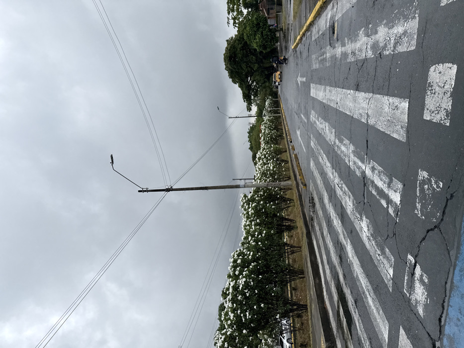 The image displays an outdoor street scene in Cali, Colombia, under an overcast sky. The foreground features an asphalt road with a faded white pedestrian crossing and two white directional arrows, one pointing straight ahead and another slightly left. The road surface exhibits multiple cracks, potholes, and small puddles of water. The right edge of the road is marked by a yellow curb. To the left, a raised median separates the road from a continuous, dense row of green shrubs abundant with white flowers. Behind these shrubs, a white sedan is partially visible parked on what appears to be a parallel street or driveway. Several utility poles with overhead power lines and attached streetlights are positioned along the left side of the road and receding into the background. Further down the road, on the right side, a yellow vehicle, possibly a taxi, is visible, followed by a person operating a motorcycle, both traveling away from the viewer. Mature green trees and a building with a red-tiled roof are situated on the right side of the street in the mid-distance. The sky is uniformly grey with heavy cloud cover, indicating diffused light conditions. No direct interactions between individuals are discernible.