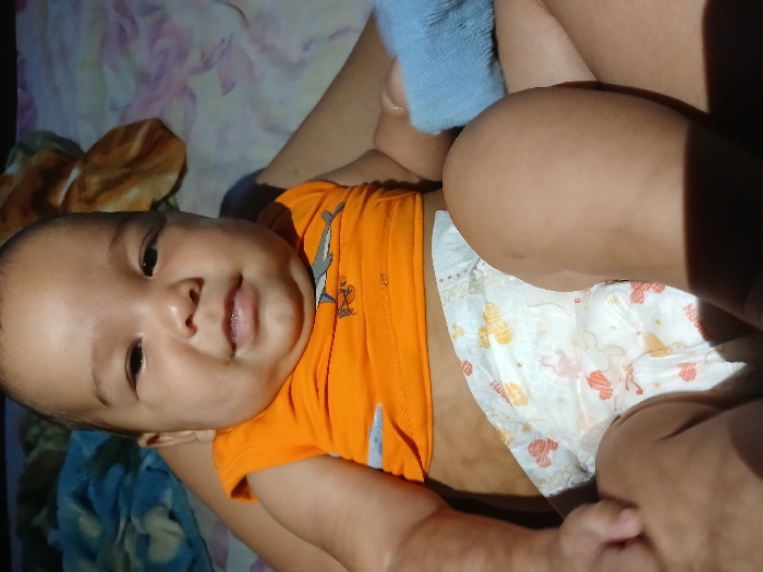 A baby wearing an orange t-shirt and a printed diaper is lying down. The baby is positioned at an angle, with its face visible, looking directly at the camera. The diaper has patterns featuring red and yellow designs. A portion of the background shows bedding with floral and other abstract patterns. The baby is partially held by someone, whose arm and hand are visible.