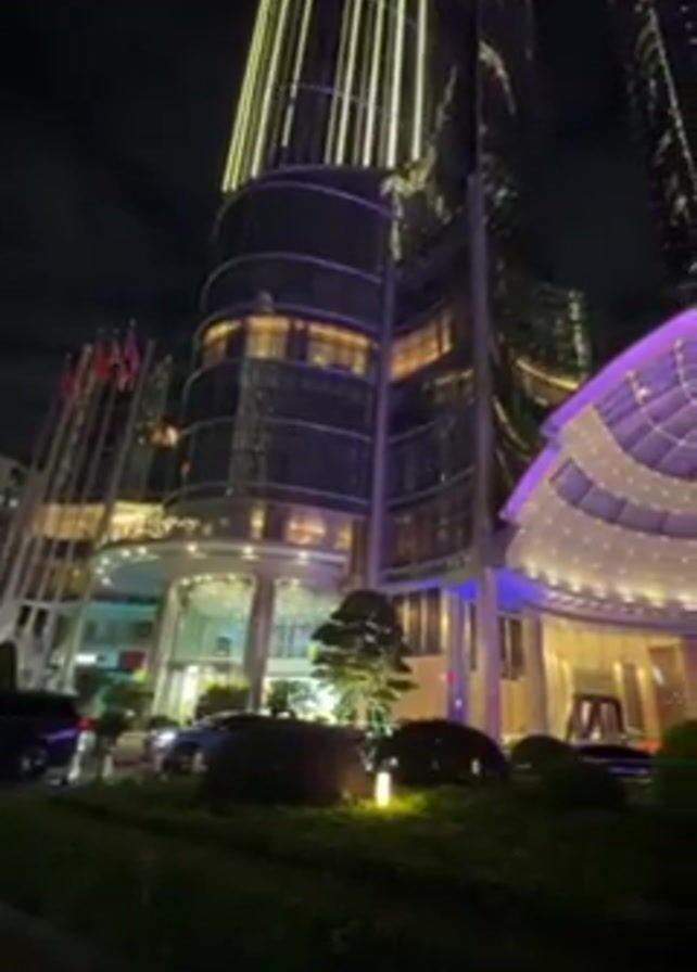 A low-angle shot shows a hotel exterior at night, focusing on the building’s architecture and illuminated features