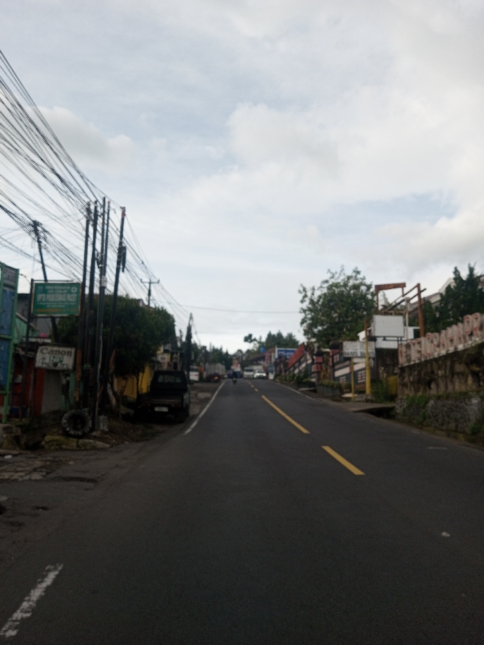 A street stretches into the distance with a center-marked yellow line. Buildings and vegetation line both sides, some with signs visible. Electrical wires crisscross overhead. A dark pickup truck is parked along the left side. The sky is overcast with clouds. The overall scene appears to be a road in a small town or village.