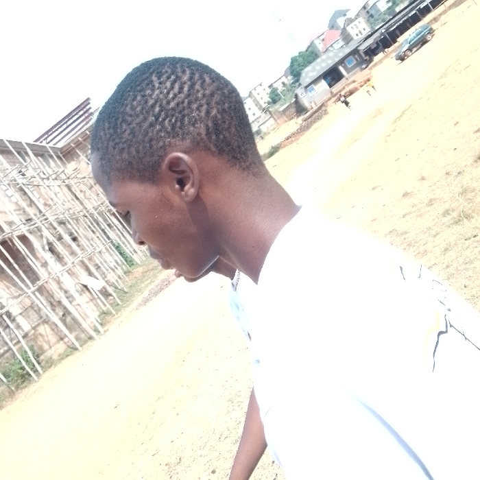 The image displays an outdoor scene in the city of Unknown, Unknown, under bright daylight conditions. A male subject with dark skin and closely cropped, dark, textured hair is positioned in the foreground, facing right with his head oriented downwards. He wears a plain white short-sleeved t-shirt; a faint, light-colored chain or necklace is visible around his neck. To the immediate left of the subject, a multi-story structure is visible, constructed primarily from numerous vertical wooden poles, consistent with scaffolding or the early framework of a building, with a section of a corrugated roof appearing at its upper edge. The ground surface is predominantly dry, light-brown dirt or sand. In the mid-ground and distant background, multiple low-rise to mid-rise buildings with varied architectural styles and roof colors are present, indicative of an urban or semi-urban environment. A dark-colored sedan automobile is parked on an unpaved surface in the mid-ground to the right. The sky is largely clear and bright. No active interactions between individuals or with objects are evident.
