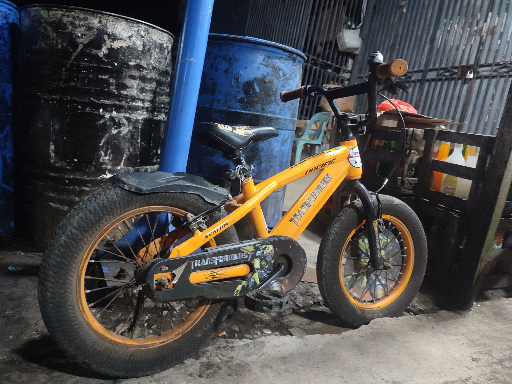 child's orange "Transformers" bicycle parked outdoors. The background includes two large metal barrels, one black and one blue, and a blue vertical pipe. The bicycle has thick tires and a cartoon depiction of a Transformers character on the chain guard. The setting appears to be a semi-enclosed area, possibly a storage space or garage, with a wooden fence-like structure visible behind the bicycle. There are several bottles and containers placed on shelves behind the bike as well. The location is likely Cotseutui, Indonesia, based on the prompt. There are no people visible in the scene.