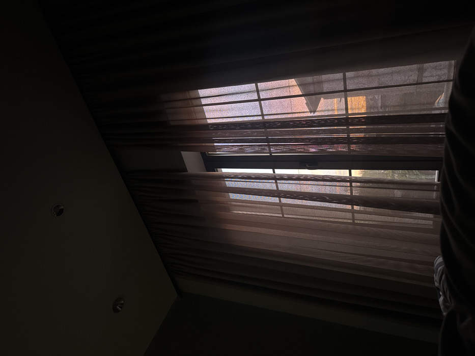The image displays an interior scene in Yerevan, Armenia, looking out through a window during either sunrise or sunset. The room's interior is dark and unlit, featuring dark-colored walls and a dark ceiling with two visible recessed light fixtures. A window dominates the central view, covered by sheer, light brown, translucent curtains that filter the exterior light. Darker, opaque curtains are drawn open to the sides, framing the sheer ones. Through the sheer curtains, the sky outside exhibits gradients of orange, pink, and purple, characteristic of twilight. On the right side of the exterior view, the roofline and a segment of a light-colored building are discernible. To the left, blurred green foliage is visible below the horizon. The window itself has a dark frame with vertical mullions, and a handle is visible on the left-hand pane, suggesting it can be opened. In the immediate foreground, a dark, out-of-focus surface, consistent with a bed or furniture, is present. No people are visible.