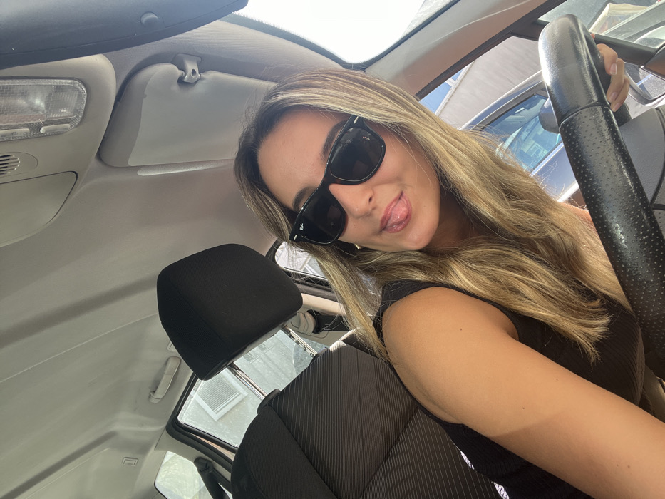 A female subject is depicted inside the driver's seat of a vehicle in Porto, Portugal. She has long, light-colored hair, wears dark-lensed sunglasses with black frames (Ray-Ban style), and a black ribbed sleeveless garment. Her head is tilted slightly, and her tongue is visibly extended from her mouth. Her right hand is positioned on the black, textured steering wheel. The vehicle's interior features a black fabric passenger seat headrest, a light-colored headliner with an overhead light fixture and grab handle. Through the windows, a bright exterior is visible, including a light-colored building structure with a rectangular aperture, suggesting an urban or suburban environment during daylight hours.