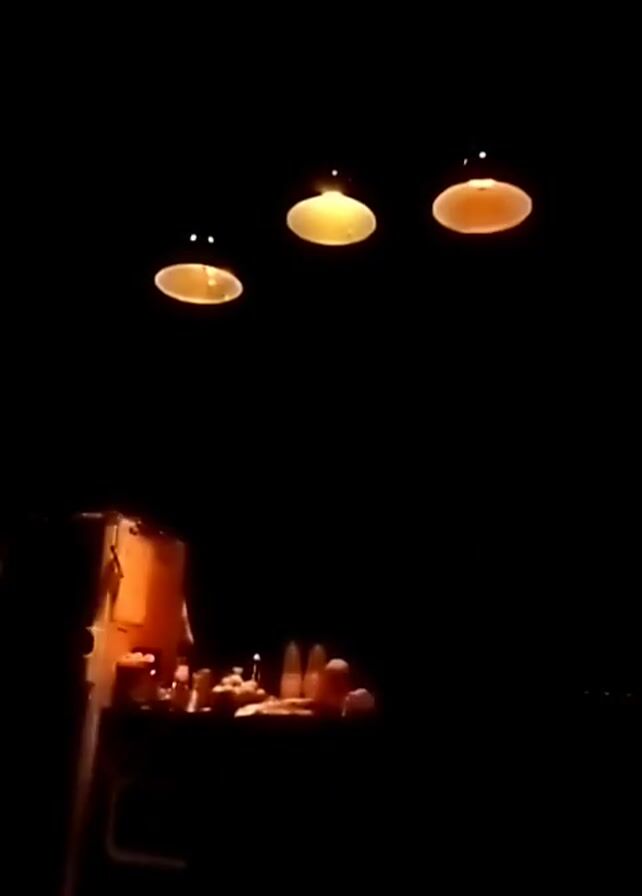 The video is taken in a dimly lit space. Three lights hang from the ceiling, each with a shade that directs the light downwards. Below the lights, in the lower portion of the frame, there is a table or counter displaying various items. A structure, possibly a cabinet or display case, stands to the left of the table. The poor lighting and limited framing make it difficult to discern specific details of the items on the table and the surroundings.