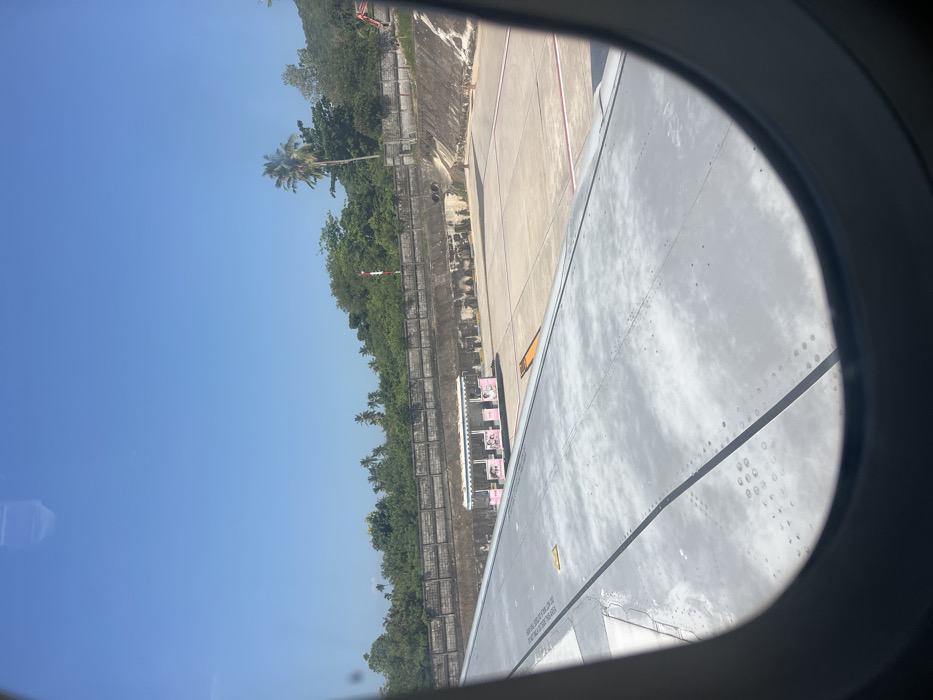 View from an airplane window showing the wing. The ground below features a concrete wall separating vegetation, including a palm tree, from a gray runway. Pink and white equipment sits along the runway. The sky is clear blue.