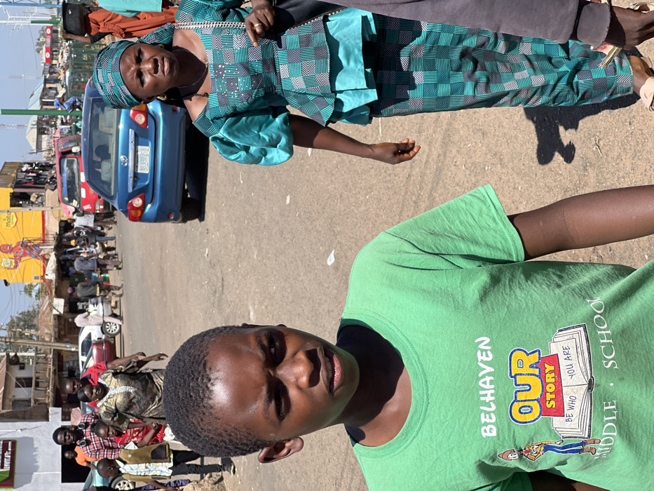 The image captures a bustling daytime street scene in Bukuru, Nigeria. In the foreground, a dark-skinned male child, estimated to be between 8 and 12 years old, is positioned towards the left. He wears a short-sleeved bright green t-shirt featuring "BELHAVEN OUR STORY BE WHO YOU ARE MIDDLE SCHOOL" and a cartoon character (Woody from Toy Story) printed on the chest. His expression is neutral to slightly serious, and his gaze is directed towards the right. To the right of the child and slightly behind him, a dark-skinned adult female walks forward. She is attired in a two-piece outfit of teal and black patterned fabric, consisting of a peplum top with prominent puffed sleeves and a matching ankle-length skirt. A matching teal headwrap covers her hair. She carries a dark shoulder bag on her left side and exhibits a serious or concerned expression, looking slightly to her left. The mid-ground and background reveal a busy urban environment. A light blue Toyota Corolla sedan, with Nigerian license plate ABJ-919-HP, is visible on the right side of the road. Further back, a red van or bus and other vehicles are present. Numerous pedestrians, including adults and children, are distributed throughout the scene, walking or standing. Buildings line both sides of the street, some appearing to be shops or commercial establishments, indicated by signage such as a large yellow "Malta" sign. The ground surface is unpaved or heavily worn asphalt, with scattered white debris visible. The scene is illuminated by bright overhead sunlight, casting defined shadows.