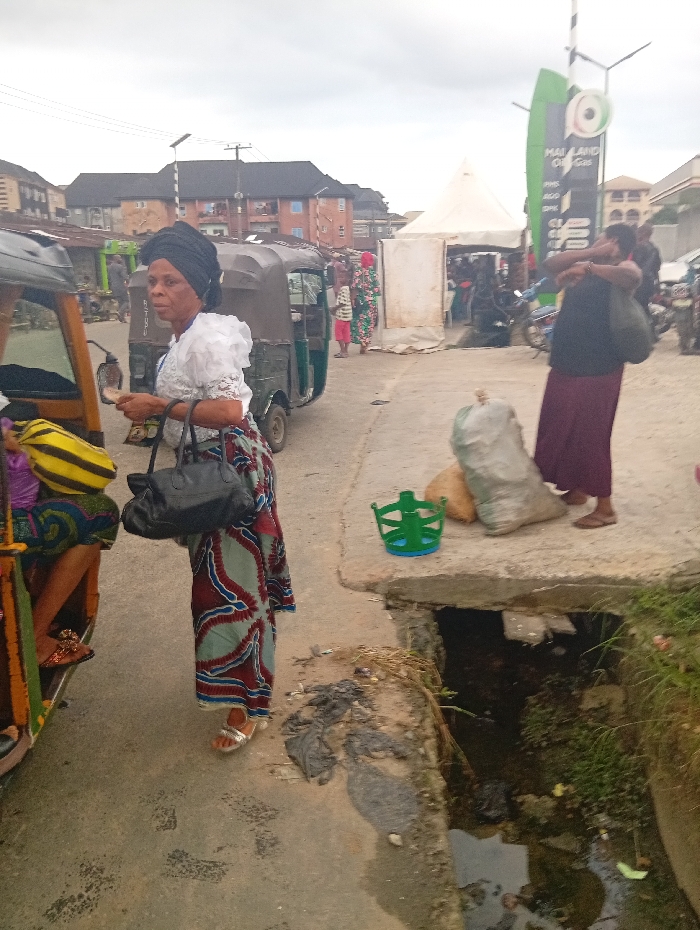 This image depicts an urban street scene in Aba, Nigeria, under an overcast sky. In the foreground, a woman stands to the left, positioned beside a partially visible yellow and green motorized tricycle. She is dressed in a white lace blouse with ruffled sleeves, a dark headwrap, a patterned wrapper (skirt) in blue, red, and white, and silver sandals. She carries a black handbag on her left arm and holds a small, reflective item in her right hand. To the right of this woman, a concrete sidewalk transitions into an open drainage ditch containing dark water, silt, and various debris including plastic bags and vegetation. On the edge of the concrete above the ditch, two large, light-colored sacks and a green plastic basket are placed. Further right in the mid-ground, a second woman stands facing partially away from the camera, wearing a dark top and a maroon skirt, with a dark bag slung over her shoulder. Her arms are raised. In the background, a green motorized tricycle is visible on the street. A prominent green and white sign for "MAJ LAND OIL & GAS" is erected on a tall pole, displaying fuel types and prices (PMS, AGO, DPK). Multi-story buildings with varying architectural styles and roof colors line the background, and a white market-style tent is set up on the right side of the street. Several other individuals are scattered throughout the mid-ground and background, indicating general street activity.