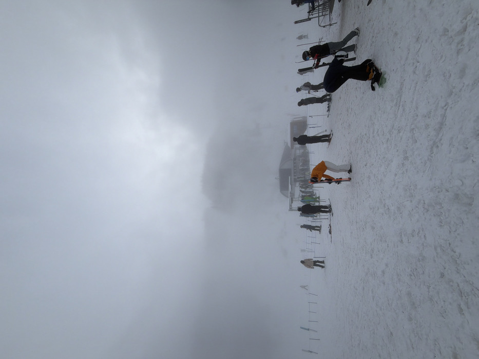A snowy ski resort on a foggy day. Several people, including skiers and snowboarders, are standing on the snow-covered ground. A building is partially visible in the background, obscured by the dense fog. The sky is overcast, contributing to the low visibility. Some skiers are bent over adjusting their equipment. Ski poles line the edge of the slope.