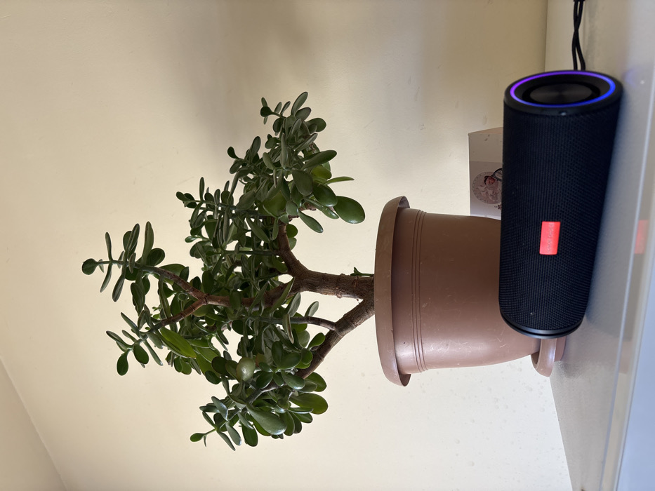 - "A potted jade plant with green leaves is positioned next to a black wireless speaker with a vibrant light ring at the top" by FM-4QNTW2, licensed under CC BY 4.0