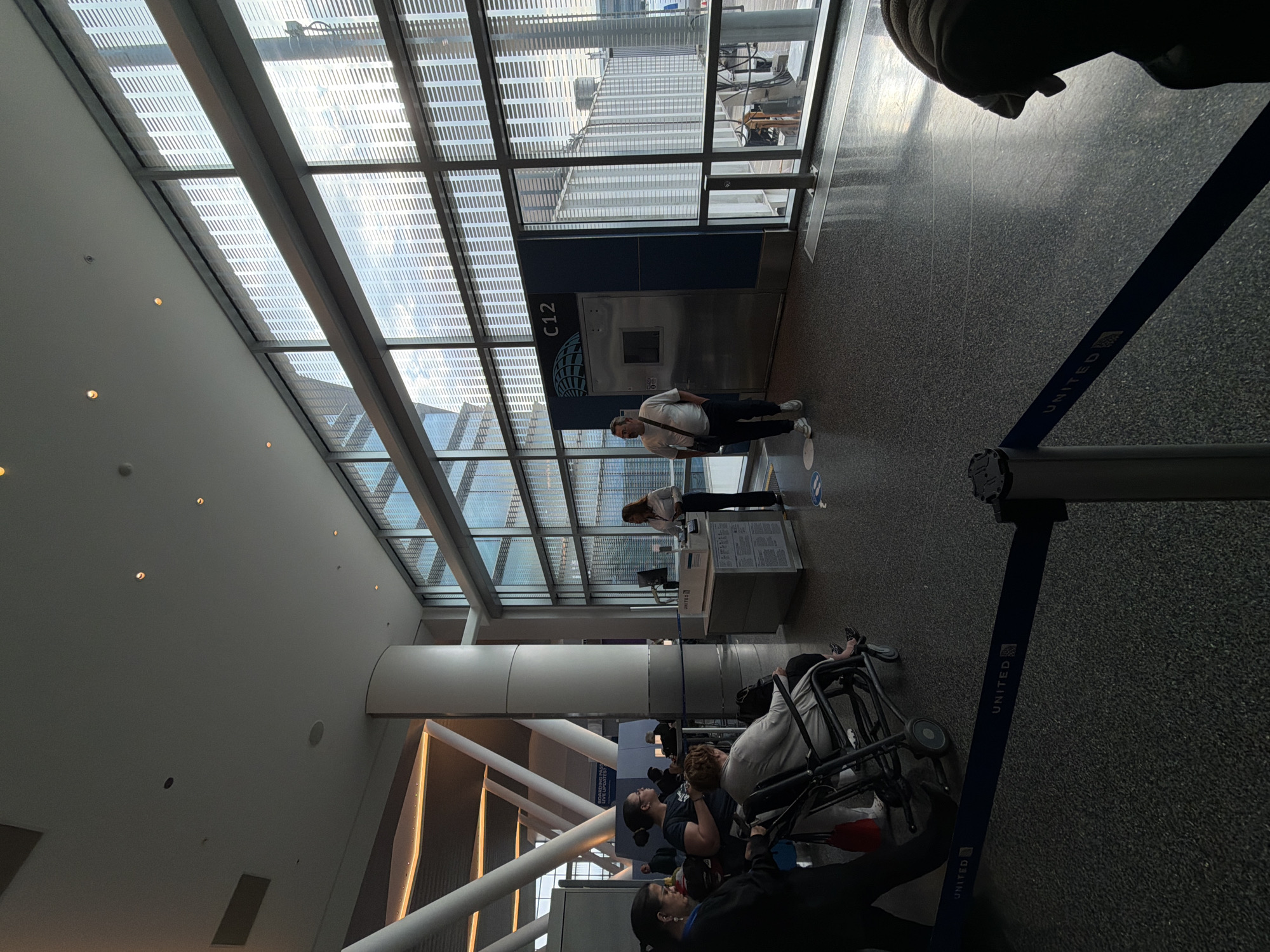 n interior view of an airport terminal, identified by the United Airlines branding on a retractable barrier. People are seen in the vicinity, some standing near a gate with the designation "C12" visible. The structure of the building includes a large grid-patterned glass ceiling, which allows natural light into the space. There's a service desk nearby with United Airlines information. The scene appears to be an airport boarding area, possibly in the city of Houston, United States of America, given United Airlines' presence at George Bush Intercontinental Airport (IAH). People are seated in the boarding area, while others are interacting with service personnel.
